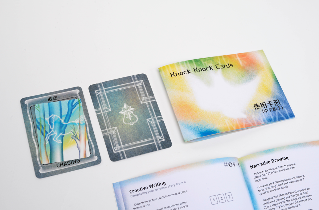 "Knock-Knock Cards" is a workshop interactive kit consisting of 78 original picture cards, 78 bilingual word cards, 2 handbooks: Chinese instructions and English instructions. The instructions include 4 creative games and 5 interactive games. As a tool for self-reflection: This game is supported by well-established psychological tools such as the Johari Window and art therapy exercises.