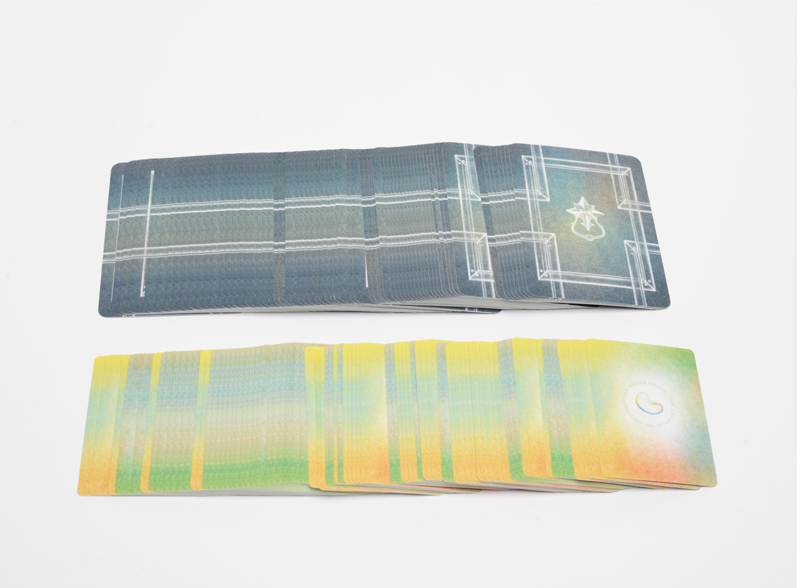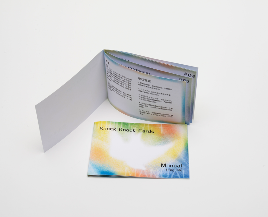 “叩叩卡“ 是由78张原创图卡、78张双语字卡、中文说明书与英文说明书组成的一份工作坊交互道具。说明书内含4种创意游戏与5种互动游戏。作为自我反思的工具: 本游戏以乔哈里窗和艺术疗法练习等成熟的心理学工具为支撑。